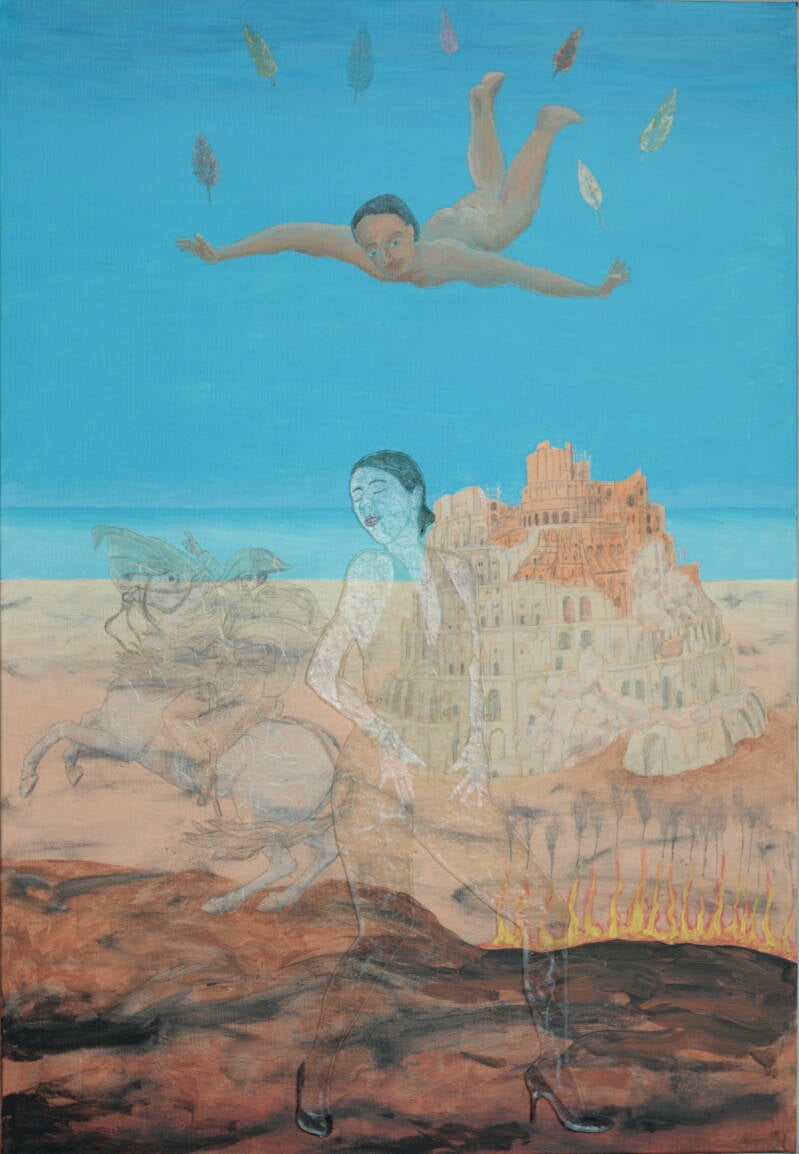 Zolang kennen we dat begrip al en toch blijft het maar doorgaan. Er zij veel voorbeelden in de geschiedenis te vinden tot aan de huidige tijd toe, maar ik heb mij tot het volgende beperkt: De toren van Babel, geschilderd naar Pieter Bruegel, Napoleon naar Jacques Louis David en Icarus naar Ubaldo Sichi. De transparante dansende en uitdagende dame op hoge hakken past bij dat soort foute types. 160x110 cm acryl op doek 2025